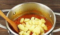 Tip: hvis der bruges hårde tomater til madlavning, skal de tilføjes sammen med kartoflerne. Røde grøntsager kan også erstattes med tomatpuré.