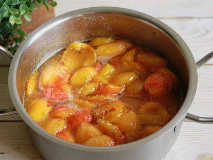 Skrællede abrikoser koges tre gange i sukkersirup. Derefter tilsættes tørrede og skrællede kerner til dem sammen med kanel. Den resulterende marmelade overføres til steriliserede krukker og anbringes et sted, der er egnet til opbevaring.