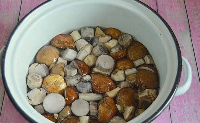 Vi renser boletus fra affald og blade. Vi skyller godt i koldt rindende vand. Vi skærer benene på boletus i cirkler og hætterne i 2-3 dele. Hæld vand i en gryde og sæt ild på. Bring det i kog, tilsæt salt og kom asp -svampe i kogende vand. Kog svampene i 30-35 minutter, kom dem derefter i et dørslag og lad dem stå i 5-10 minutter for at dræne vandet.