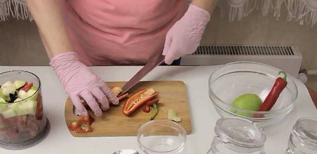 Den geschälten Knoblauch in eine Schüssel geben. Alle Zutaten zu Püree mahlen. Fügen Sie dann die erforderliche Menge Salz und Pflanzenöl zu der resultierenden Adjika hinzu und mischen Sie alles gut. Adjika in ein steriles Glas geben und mit einem beliebigen Deckel verschließen. Diese Adjika kann gut 6 Monate im Kühlschrank aufbewahrt werden.