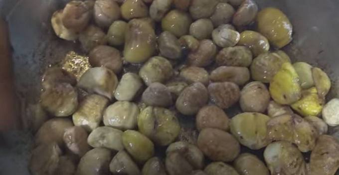Zubereitung der Kastanien. Wir waschen sie, schneiden sie quer und legen sie in einen Topf. Mit Wasser auffüllen und auf den Herd stellen. Wir warten bis zum Kochen und kochen dreißig bis vierzig Sekunden. Dann nehmen wir die Schmorpfanne vom Herd, nehmen eine Kastanie mit einem Löffel heraus und schälen den Kern vorsichtig von der Haut, indem wir uns mit einem Messer bedienen. Wir geben die geschälten Kastanien in einen separaten Behälter und füllen sie mit Wasser, damit sie nicht austrocknen.
