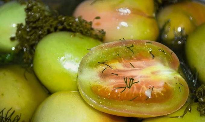 Dann die Tomaten fest auflegen. Wasser in einem Topf aufkochen, salzen, umrühren und die Salzlake vom Herd nehmen. Auf 70-75 Grad abkühlen lassen und die Tomaten mit Salzlake füllen. Das restliche Grün und das Meerrettichblatt auf die Tomaten legen. Wir verschließen den Behälter mit einem Deckel und lassen ihn 6-7 Tage bei Raumtemperatur. Dann legen wir die Tomaten für 25-30 Tage in die Kälte.