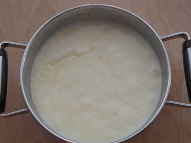 Die Hälfte der Sahne in einen Topf geben, erhitzen. Den zweiten Teil der Sahne kalt mit Gelatine oder Agar-Agar verrühren. Zuvor muss Gelatine mindestens 20 Minuten in kaltem Wasser quellen. Wenn die Sahne kocht, nicht länger als eine Minute köcheln lassen, dann vom Herd nehmen und vollständig abkühlen lassen.
