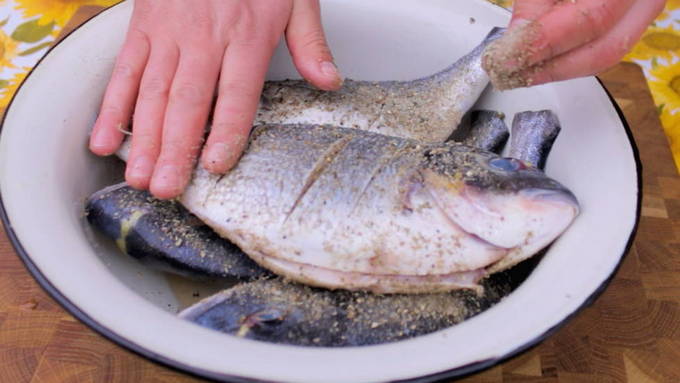 Übertragen Sie den zubereiteten Fisch in eine tiefe Marinierungsschüssel. Anschließend die Fischkadaver mit Zitronensaft übergießen und innen und außen mit der vorbereiteten Gewürzmischung einreiben. Die minimale Zeit zum Marinieren beträgt 30 Minuten, aber es ist besser, den Fisch mit Gewürzen für 1–1,5 Stunden in den Kühlschrank zu stellen.