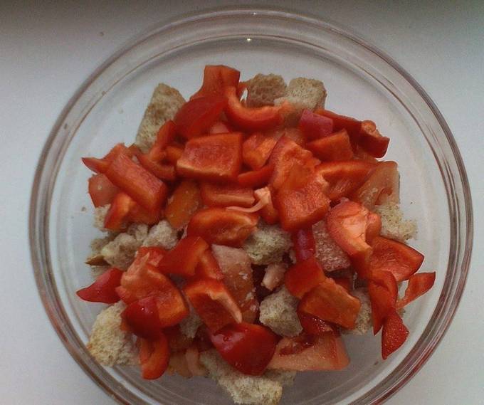 Wir waschen die Tomaten, legen sie in eine tiefe Schüssel und gießen kochendes Wasser darüber. 1-2 Minuten einwirken lassen und dann das Wasser abgießen. Füllen Sie die Tomaten sofort mit kaltem Wasser und entfernen Sie dann die Schale. Tomaten in große Würfel schneiden, in eine Schüssel geben. Grobes Brot muss in Stücke gebrochen, mit Zitronensaft beträufelt und mit Tomaten auf einen Teller gelegt werden.