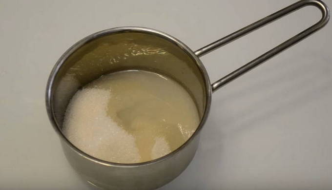 Die abgemessene Menge Zucker in einen Topf geben, 4 EL Wasser dazugeben und bei schwacher Hitze erhitzen. Unter ständigem Rühren, um den Zucker vollständig aufzulösen, den Sirup zum Kochen bringen. Sie können den Sirup 3 Minuten in der Mikrowelle kochen, öffnen Sie einfach die Tür und rühren Sie den Sirup um.