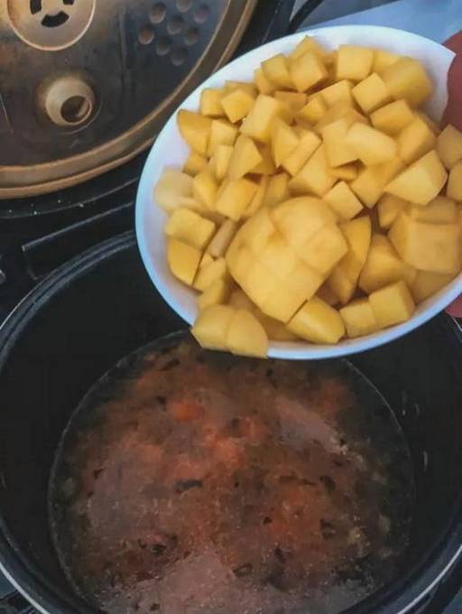 Geben Sie dann das geräucherte Schweinefleisch in die Multicooker-Schüssel. Fügen Sie Salz, schwarzen Pfeffer und Lorbeerblätter hinzu. Stellen Sie das Suppenprogramm auf dem Multicooker-Bedienfeld ein, die Kochzeit beträgt 1 Stunde 30 Minuten. Schließen Sie den Deckel des Multikochers und drücken Sie die Taste "Start", kochen Sie bis zum Ende des Programms.