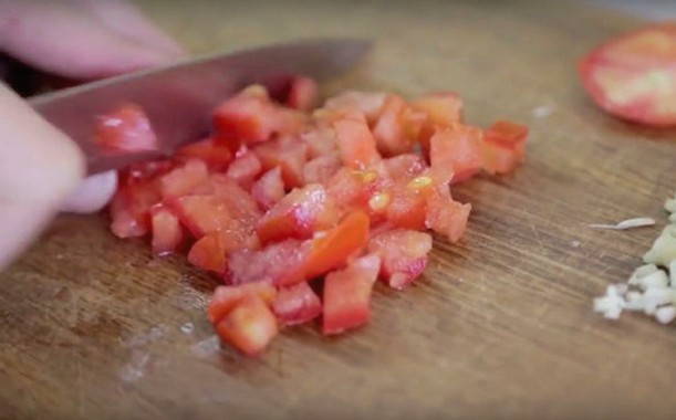 Wir reinigen die Paprika von Samen und Stielen, spülen sie ab und schneiden sie in Streifen. Wir waschen die Zucchini, schneiden die Enden ab, entfernen die Kerne und schneiden die Schale ab, wenn die Früchte reif sind. Junge Zucchini können ganz verwendet werden. Schneiden Sie das Zucchini-Fruchtfleisch in etwa drei bis vier Zentimeter große Stücke.