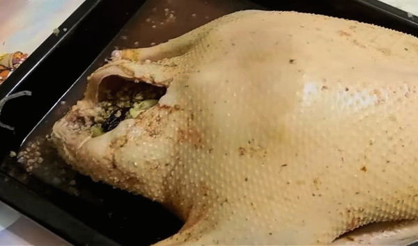 Gans mit Äpfeln, Buchweizen und Pflaumen im Ofen