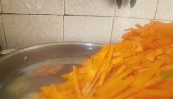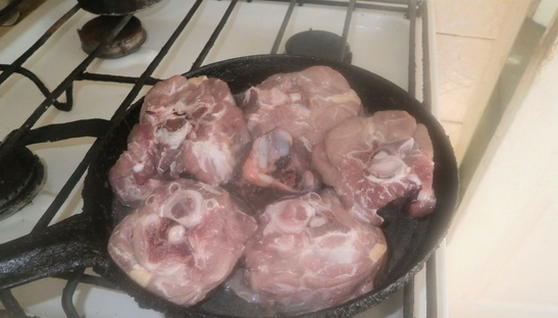 Legen Sie das gebratene Lamm in einen tiefen Topf. Gießen Sie vorbereitetes kochendes Wasser ein. Auf mittlere Hitze stellen und zum Kochen bringen, dabei den entstandenen Schaum regelmäßig mit einem Schaumlöffel oder einem feinen Sieb abschöpfen. Dann die Hitze reduzieren und das Lamm etwa 40-50 Minuten garen, bis es gar ist.