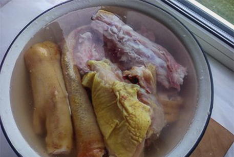 Damit das Gelee gut gefrieren kann, sollte es aus Teilen von Hühnchen und Schweinefleisch mit vielen kleinen Knochen und Gelenken gekocht werden. Am Ende erhalten Sie ein natürliches und gesundes Produkt.