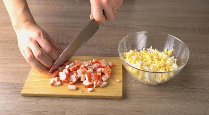 Krabbenstäbchensalate werden perfekt durch frischen Kohl ergänzt. Das Gemüse macht den Snack leichter und frischer. Das Gericht eignet sich sowohl für ein Mittagessen zu Hause als auch für ein festliches Menü.