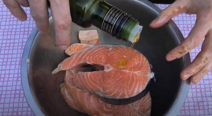 Olivenöl über den Fisch gießen. Die Menge hängt von den persönlichen Vorlieben und dem Fettgehalt des Fisches ab. Wenn dies rosa Lachs ist, dann bereuen wir das Öl nicht. Für beispielsweise Lachs können Sie eine kleinere Menge verwenden. Jedes Steak muss mit den Händen mit Öl eingefettet werden, damit die gesamte Oberfläche damit bedeckt ist. Wir lassen den Fisch eine halbe Stunde marinieren.
