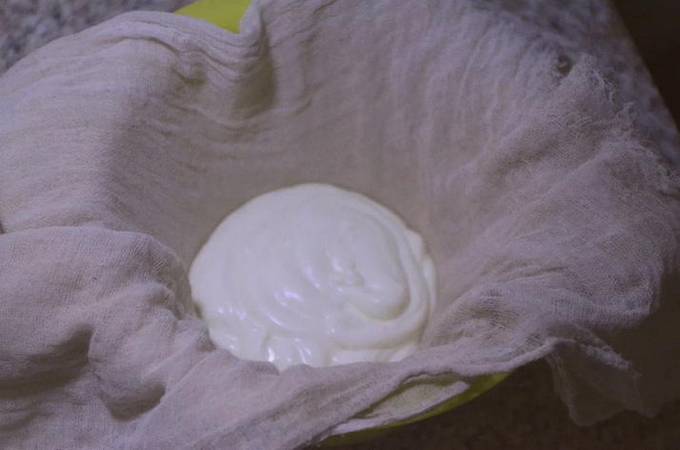 Messen Sie zunächst die erforderliche Menge Sauerrahm, Laden oder Dorf ab. Bereite ein Käsetuch, einen Verband oder ein sauberes, trockenes Küchentuch vor. Decken Sie ein Sieb oder Sieb mit der vorbereiteten Gaze ab, die in mehreren Schichten gefaltet ist, und geben Sie dann eine abgemessene Menge Sauerrahm hinein.