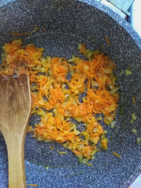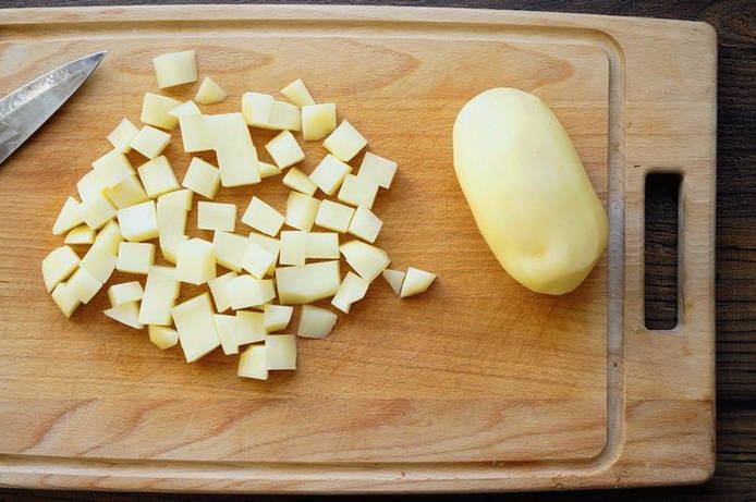 Die vorbereiteten Kartoffeln in die kochende Brühe geben, die Zwiebeln und Karotten anbraten, die Suppe zum Kochen bringen. Inzwischen wurde der Grießteig aufgegossen und eingedickt. Wir nehmen kleine Portionen des Teigs mit einem Teelöffel und tauchen sie in die kochende Suppe. Die Knödel unter Rühren sieben bis zehn Minuten garen. Die Knödel sollten aufschwimmen und merklich an Volumen zunehmen.