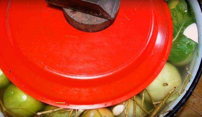 Nach diesem Rezept können Sie grüne Tomaten direkt auf dem Land in einem Topf fermentieren, nur der Topf muss groß sein. Es ist sehr bequem. Aus irgendeinem Grund sind Tomaten beim Einlegen in einem Topf weniger salzig und schmackhafter als in einem Eimer. Sparen Sie nicht an Gemüse und Gewürzen. Versuch es!