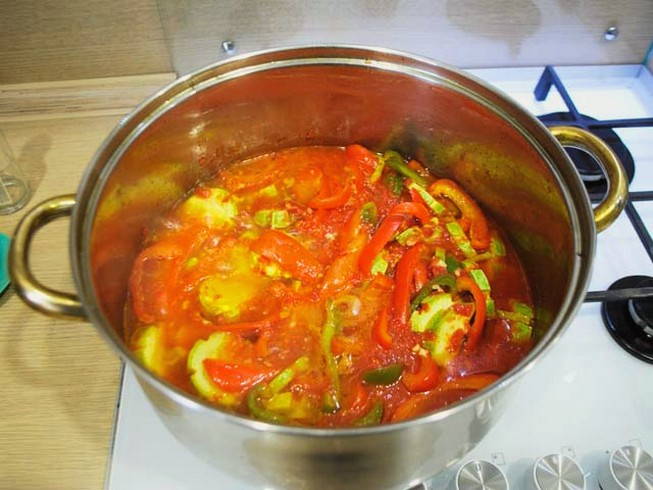 Lecho ab Beginn des Kochens bei schwacher Hitze und unter geschlossenem Deckel 20 Minuten köcheln lassen. Wenn das Gemüse grob gehackt ist, die Schmorzeit verlängern. Rühren Sie das Lecho während des Dünstens mit einem Holzlöffel um. Bestimmen Sie die Bereitschaft des Gerichts durch die Weichheit des Gemüses.
