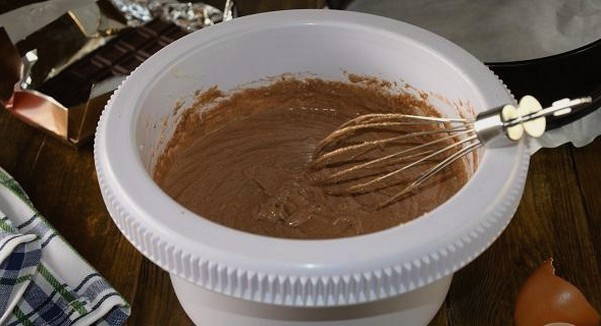 Die weiche Butter in eine separate Schüssel geben, Kristallzucker, Vanillezucker und Salz hinzufügen. Mit einem Mixer bei mittlerer Geschwindigkeit glatt rühren. Fügen Sie alle Eier nacheinander hinzu und verquirlen Sie sie nach jeder Zugabe gründlich. Dann verteilen wir den gequollenen Grieß auf die Ölmischung, fügen Kakaopulver, Backpulver und Mehl hinzu, gießen Pflanzenöl ein. Alle Zutaten mit einem Mixer schlagen, bis ein homogener, ziemlich dicker Teig entsteht.