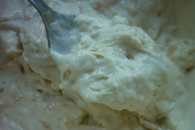 Wir erhitzen Kefir leicht in der Mikrowelle auf 37 Grad, oder Sie können ein Glas Kefir in einen Behälter mit warmem Wasser geben. Kefir in eine Schüssel geben, Hüttenkäse hinzufügen. Wir kneten alles gründlich, damit keine Klumpen entstehen. Als nächstes fügen Sie dem Teig Zucker, Soda und Vanillin hinzu. Dann den geriebenen Apfel dazugeben und die Masse glatt kneten. Dann das Mehl sieben und erneut mischen.