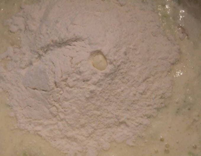 Das Mehl sieben und zusammen mit dem Backpulver in die Quark-Apfel-Masse geben. Den Teig mit einem Löffel oder einer Gabel kneten, um eine Gleichmäßigkeit zu erreichen und die Mehlklumpen zu brechen. Die Endkonsistenz sollte ziemlich dick sein, zukünftige Pfannkuchen sollten in der Pfanne ihre Form behalten und nicht kriechen.