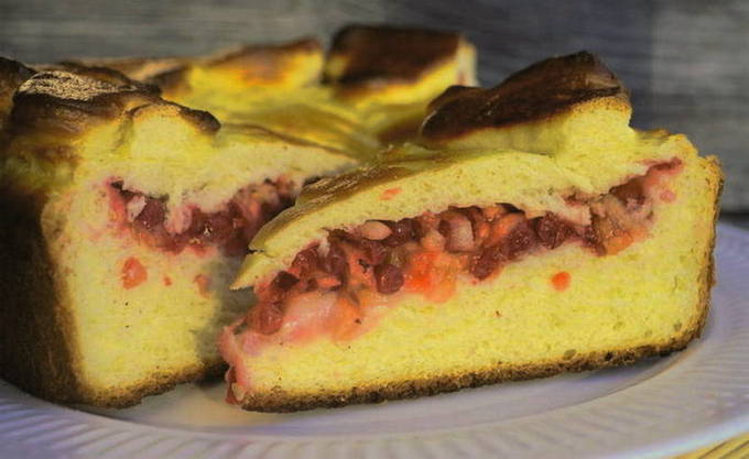 Zunächst wird ein Hefeteig mit Kefir hergestellt. Es wird ausgerollt und mit Preiselbeeren, geriebenem Apfel, Zucker und Stärkefüllung gefüllt. Alles wird mit dem zweiten Teil des Teigs verschlossen, mit einem Ei bestrichen und 30-40 Minuten gebacken.