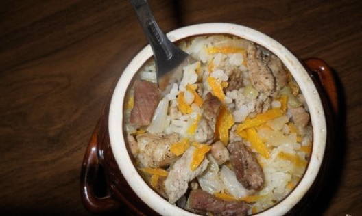 Gebratenes Gemüse und Lamm in einen Topf geben. Den gut gewaschenen Reis darüber geben. Den Reis mit etwas Salz und Gewürzen bestreuen. Gießen Sie dann heißes Wasser im richtigen Verhältnis zum Reis in den Topf. Decken Sie den Topf mit einem Deckel oder einem Stück Folie ab und stellen Sie ihn in den kalten Ofen. Dann den Ofen bei 200°C einschalten und den Pilaw 1 Stunde backen. Schnell und einfach zubereitet können Sie sofort leckeren Pilaw servieren.