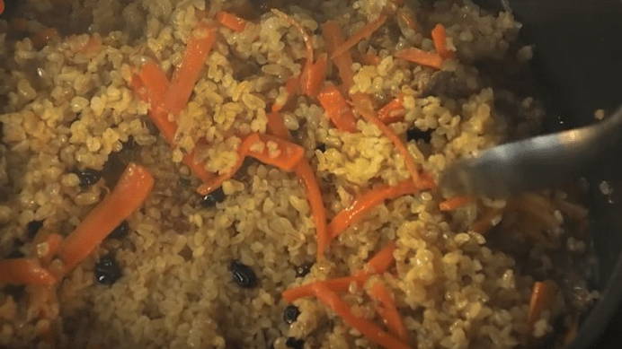 Dann das Müsli in einer gleichmäßigen Schicht auf dem Rindereintopf verteilen. Grütze nicht mit Fleisch mischen. Gießen Sie sauberes Wasser in den Kessel 1 Finger über der Bulgurschicht. Wir schließen den Deckel des Kessels. Pilaw mit Bulgur bei schwacher Hitze 20 Minuten köcheln lassen. Diese Zeit reicht aus, um das Müsli zu kochen.