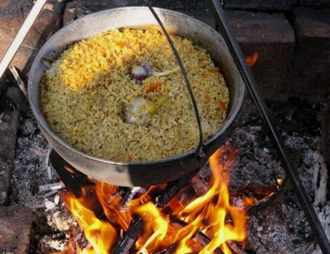 Pilaw mit Ente in einem Kessel auf dem Feuer