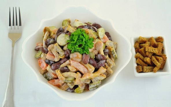 Salat mit Bohnen, Schinken und Croutons