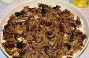 Als nächstes die Zwiebel schälen und in ein kleines Quadrat schneiden. Die Pilze sollten unter fließendem Wasser abgespült und in Teller geschnitten werden, und dann zusammen mit den Zwiebeln in die Pfanne gegeben und in Butter gebraten werden. Wenn sie fertig sind, schicken wir die Pilze und Zwiebeln in die Salatschüssel zum gehackten Hähnchenfilet.