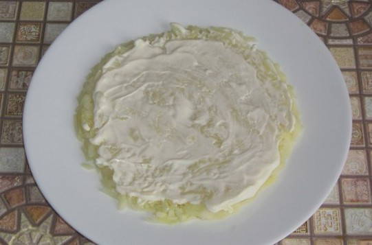 Wir waschen die Kartoffeln, kochen sie, ohne sie zu schälen. Wir kochen auch Eier. Nachdem die Eier und Kartoffeln gekocht sind, müssen sie abgekühlt und geschält werden. Wir nehmen einen flachen Teller. Die erste Schicht besteht darin, die Kartoffeln zu verteilen, die auf einer mittelgroßen Reibe gerieben werden. Diese Schicht muss leicht gesalzen und mit einer dünnen Schicht Mayonnaise eingefettet werden.