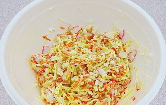 Salat mit Krabbenstäbchen, Karotten und Käse