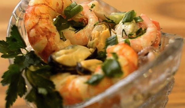 Salat mit Garnelen, Tintenfisch, Muscheln und Krabbenstäbchen