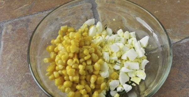 Heute können Sie in jedem Geschäft ganz einfach Garnelen finden und Ihre Lieben mit einem köstlichen Salat erfreuen. Der neutrale Geschmack von gekochten Eiern, süßem Dosenmais und zarten Garnelen macht dieses Gericht hell und sättigend. Und Mayonnaise kann immer durch Sauerrahm, Naturjoghurt oder andere interessantere und komplexere Dressings ersetzt werden.