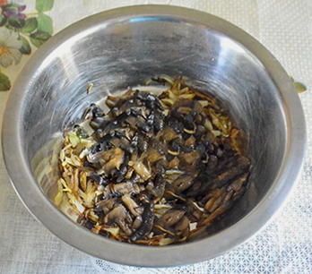 Salat mit Hühnchen, Champignons, koreanischen Karotten und Ei