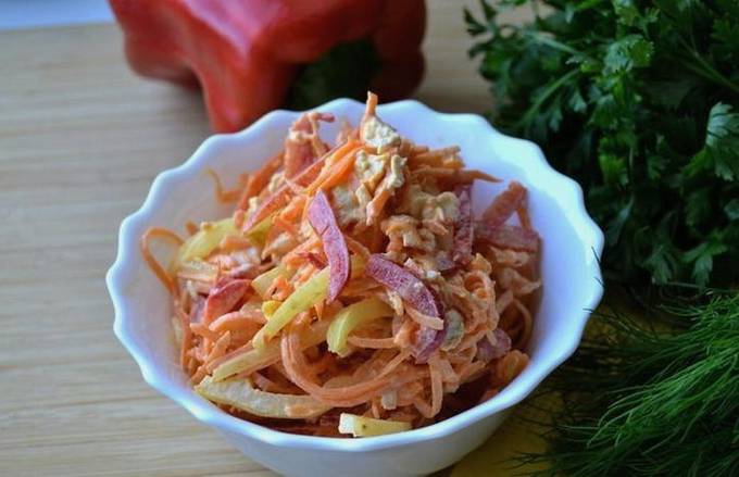 Salat mit Hühnchen, koreanischen Karotten, Paprika und Tomaten