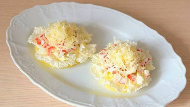Pekingkohl passt zu vielen Speisen und seine Verbindung mit Ananas ist fast schon klassisch geworden. Wir ergänzen diese bekannte Kombination mit Krabbenstäbchen und ändern die Servierform des Salats – und schon kann das Gericht den Eindruck einer absoluten Neuheit erwecken.