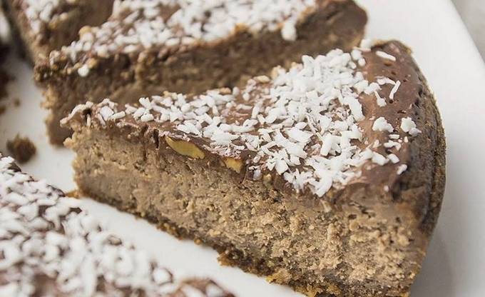 Für den Schokoladenüberzug die Schokolade in kleine Stücke brechen und die Sahne in einen kleinen Topf geben. Die Zutaten auf dem Herd erhitzen, bis sich die Schokolade vollständig aufgelöst hat. Lassen Sie die resultierende Mischung abkühlen und bedecken Sie die Oberfläche des Käsekuchens nach dem Abkühlen damit. Kokosflocken gleichmäßig auf die verteilte Beschichtung gießen. Wir stellen das Dessert für eine halbe Stunde in den Kühlschrank, damit die Glasur aushärtet.