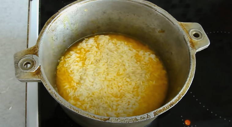Gießen Sie dann heißes Wasser in einer solchen Menge in den Kessel, dass der Inhalt drei Zentimeter bedeckt ist. Wir probieren die resultierende Brühe - sie muss gut gesalzen sein, damit der Reis im Pilaw nicht langweilig wird. Das Wasser aus dem Reis abgießen und in einen Kessel geben. Richten Sie es in einer flachen Schicht aus, ziehen Sie mit einem Spatel an den Rändern entlang, um den Reis um den Umfang des Kessels näher zur Mitte zu bewegen. Wir schließen den Deckel und kochen 15 Minuten lang Pilaw auf dem Herd.