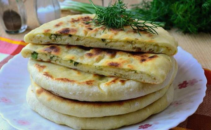 Mit Käse und Kräutern gefüllte Tortillas auf Kefir-Teig sind ein gängiges Gericht in der kaukasischen Küche. Sie sind so lecker und einfach zuzubereiten, dass sie sich weit über die Grenzen des Kaukasus hinaus verlieben. Der Teig ist weich, mit dichter Kruste und die Füllung erstreckt sich mit Fäden aus geschmolzenem Käse - das ist sehr lecker. Frischer Dill ist perfekt für das Aroma. Die Tortillas werden in einer trockenen Pfanne gebraten und vor dem Servieren reichlich mit Butter eingefettet. Sie können die Kuchen auch mit etwas Knoblauch einfetten, der durch eine Presse geleitet wird - dies verleiht den Produkten eine charakteristische Schärfe.