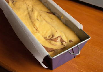 Fetten Sie die Auflaufform mit Butter ein (Sie können jede nehmen, aber mit Butter schmeckt es besser). Schokoladen- und Kürbisteig abwechselnd mit einem Esslöffel darauf geben. Sie können auch einen Holzspieß oder eine Gabel nehmen und mit chaotischen Bewegungen ein ausgefallenes Muster auf dem Teig erzeugen.