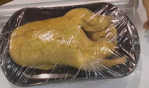 Die Schale einer Orange abreiben, dann den Saft auspressen. Knoblauch schälen und durch eine Presse passieren, Pfeffer und Salz in einem Mörser mahlen. Den Kadaver mit Orangensaft und einer Mischung aus Knoblauch und Schale bestreichen, in Frischhaltefolie wickeln und 8 Stunden im Kühlschrank marinieren lassen.