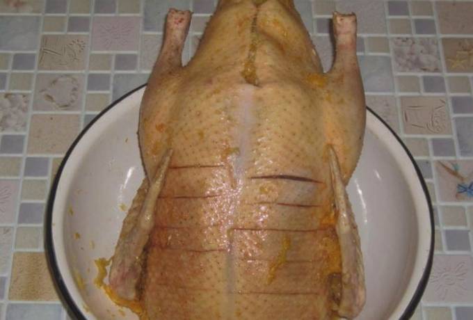 Schmieren Sie die gefüllte Karkasse mit der resultierenden Orangen-Honig-Marinade. Wir legen den Vogel in eine tiefe Schüssel, ziehen ihn mit Frischhaltefolie fest und stellen ihn zum Marinieren für sieben bis acht Stunden in den Kühlschrank. Es ist praktisch, es über Nacht stehen zu lassen und morgens oder nachmittags mit dem anschließenden Backen zu beginnen.