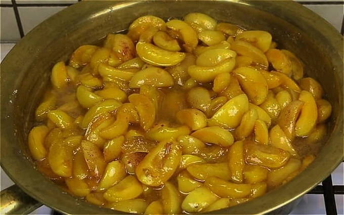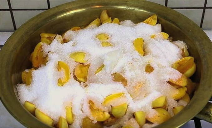 Geschälte Aprikosen werden in einen Topf gegeben und mit einer Mischung aus Gelatine und Zucker bedeckt. Nachdem sie den Saft ausgelassen haben, wird der Topf angezündet und die Marmelade 5-6 Minuten geköchelt.
