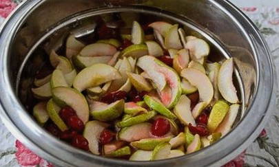 Bereiten Sie alle Zutaten vor, die Sie für die Herstellung der Hartriegel- und Birnenmarmelade benötigen. Hartriegel sortieren, in ein Sieb geben, gründlich abspülen und überschüssige Flüssigkeit abtropfen lassen. Birnen gründlich waschen, halbieren, Kerngehäuse entfernen und in Spalten schneiden. Die vorbereiteten Birnen in eine Metallschüssel mit schwerem Boden geben.