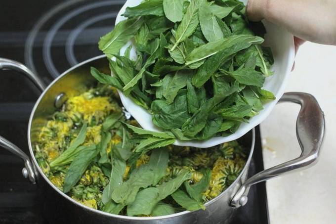 Wir bereiten Produkte für Marmelade vor. Dazu sortieren wir die Blüten des Löwenzahns sorgfältig von möglichen Verunreinigungen. Schneiden Sie die Stiele ab, wenn sie übrig bleiben, werden nur Blüten mit Kelchblättern benötigt. Wir wählen junge Minzzweige mit kleinen Blättern und zarten Stielen - solche Grüns duften stärker. Pfefferminze kann das größte Aroma verleihen.