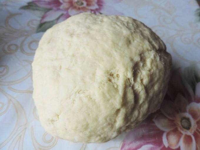 Die geronnene Milch aus dem Kühlschrank nehmen und erhitzen. In eine tiefe Schüssel gießen, ein Hühnerei zerbrechen, Kristallzucker, Backpulver und Salz hinzufügen. Gründlich mischen. Das Weizenmehl nach und nach durch ein Sieb sieben, umrühren, den Teig auf eine saubere Unterlage geben, gut mischen, mit Frischhaltefolie abdecken und eine halbe Stunde ruhen lassen.