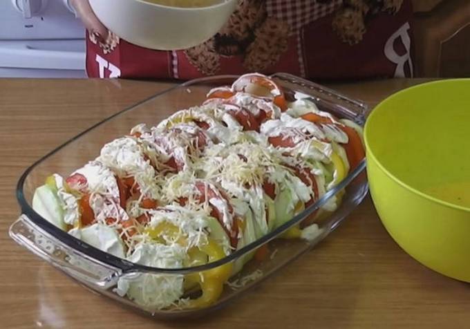 Wir bieten Ihnen ein Rezept für einen köstlichen und leichten Gemüseauflauf, der eine ausgezeichnete Beilage zu Fleischgerichten ist, sowohl auf der täglichen als auch auf der festlichen Tafel. Gemüse wird in einer Ei-Milch-Füllung gebacken, was es sehr zart macht. Der Käse, der über den Auflauf gestreut wird, verleiht ihm Saftigkeit und bildet beim Backen eine köstliche goldbraune Kruste.