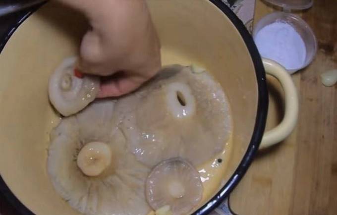 Reinigen Sie die gesammelten weißen Milchpilze von Waldresten und entfernen Sie die Basen der Beine. Anschließend die Champignons abspülen und in einen tiefen Behälter geben, je nach Menge Ihrer Champignons. Füllen Sie die Milchpilze 2 Tage lang mit kaltem Wasser und legen Sie etwas Druck darauf, damit die Pilze vollständig in Wasser eingetaucht sind. Wechseln Sie das Wasser alle 6-8 Stunden.