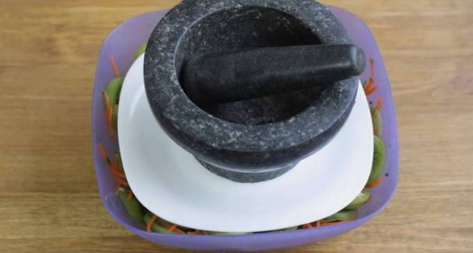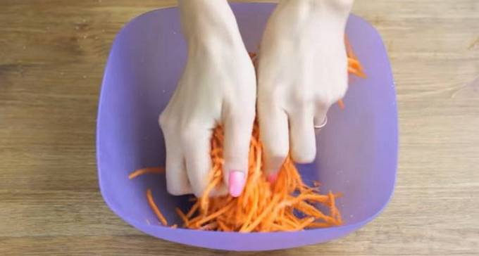 Karotten schälen, abspülen und trocknen. Wir reiben es auf einer Karottenreibe auf Koreanisch. In eine Schüssel geben und mit der Hälfte der angegebenen Menge Salz und Kristallzucker bestreuen. Wir drücken die Karotten mit unseren Händen, um sie etwas weicher zu machen und den Saft erscheinen zu lassen.